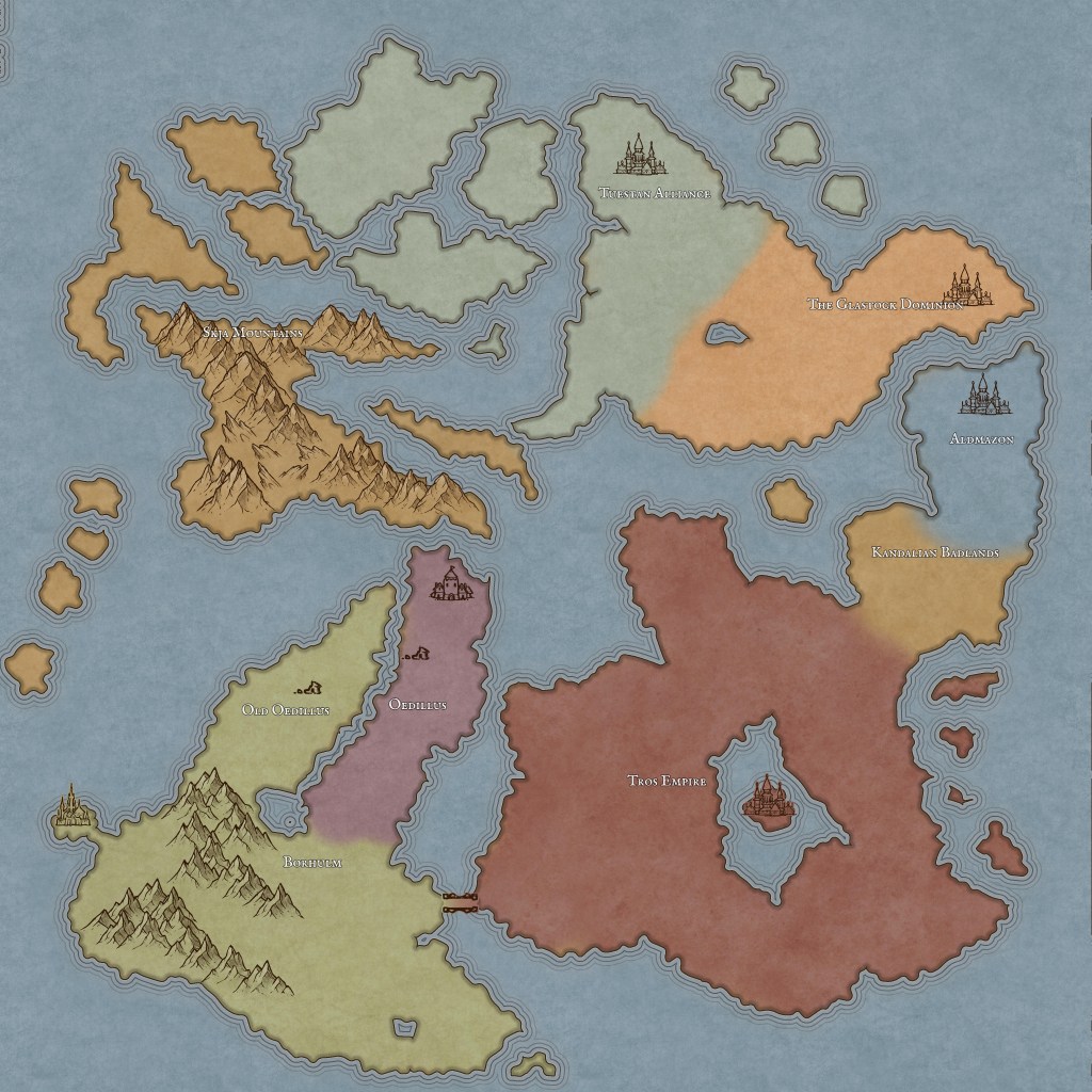 The map needs a lot of work still. I’m using Inkarnate because I used that a lot for DnD map stuff. Great tool! I will be adding a lot more landmarks, geographical features, and detail to this map.